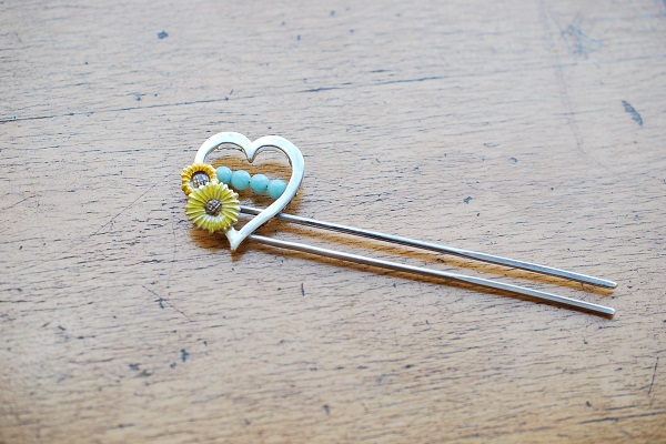 今日は以前ご紹介したハートモチーフにヒマワリのパーツを付けたかんざしを作っている生徒さんが、かんざしを完成されたのでご紹介します。