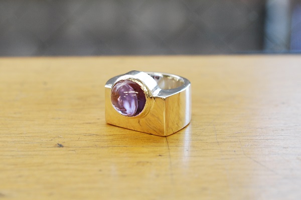 丸みのあるアメジストを際立たせるようにリング部分は直線的なデザインにされています。