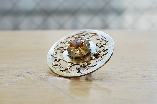 真鍮の板から糸鋸で透かしたパーツとシルバーの地金から製作した石座を組み合わせた、とても凝った作りになっています。