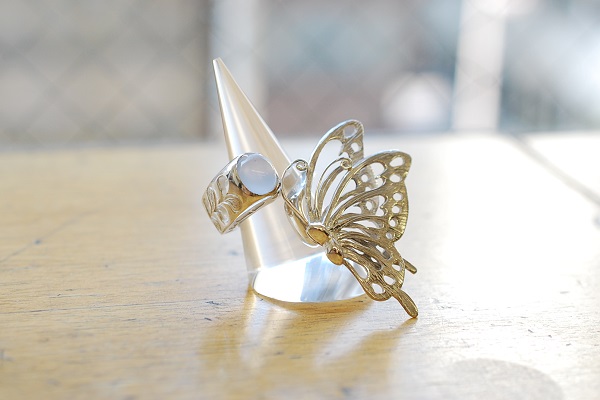 リング本体部分はハードワックスを削って作り、蝶のパーツはシートワックスを加工して製作されました。