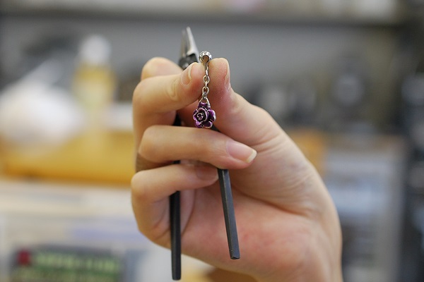 今日の授業風景 今日も午前から授業をしています。シルバーのバラのモチーフのピアスを製作されています。バラの部分を紫外線で固まるレジンで紫色に色付けされています。シルバーのパーツに色を付けることで華やかなピアスになりました。