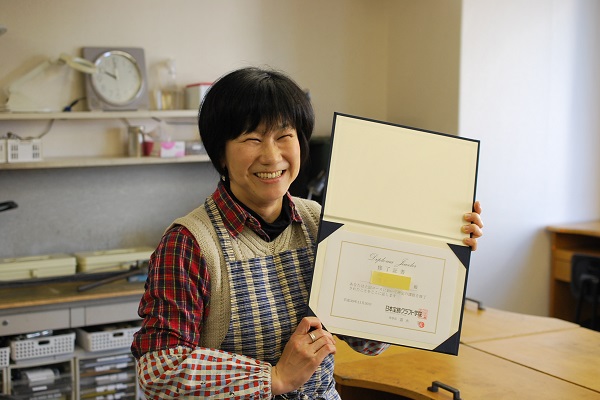 日本宝飾クラフト学院大阪校閉校時に彫金教室muro工房にそのまま移られた生徒さんに、日本宝飾クラフト学院の専科コースの修了証をお渡しできました。