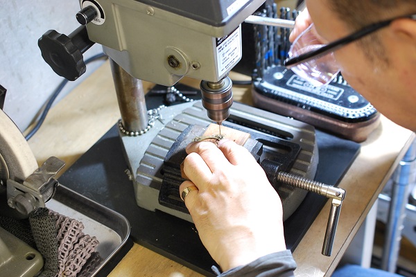 柄をすかすために下穴をあけておられます。