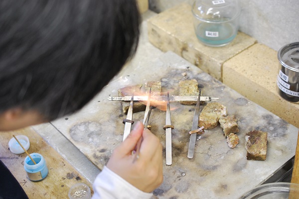 薄い板状のシルバーに角棒を3本ロウ付けされています。バングルは大きいのでロウ付けするのが大変です。しっかり押さえておかないと角棒が熱で浮いてしまうので注意しながらロウ付けされていました。