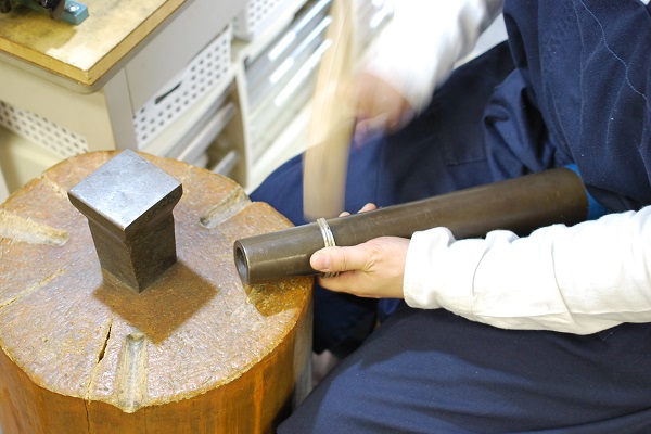 無事ロウ付けが終わったので成形しておられます。バングルは大きいので成形するのも大変そうです。