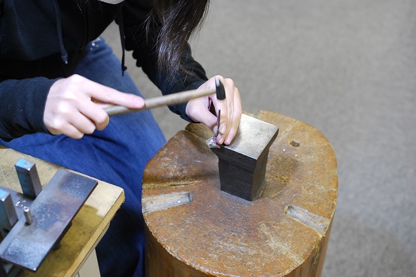 シルバーの塊を叩いて大まかにスプーンの形を作っています。