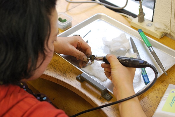 翡翠を安定してセットできるように微調整してから仕上げ作業をされています。