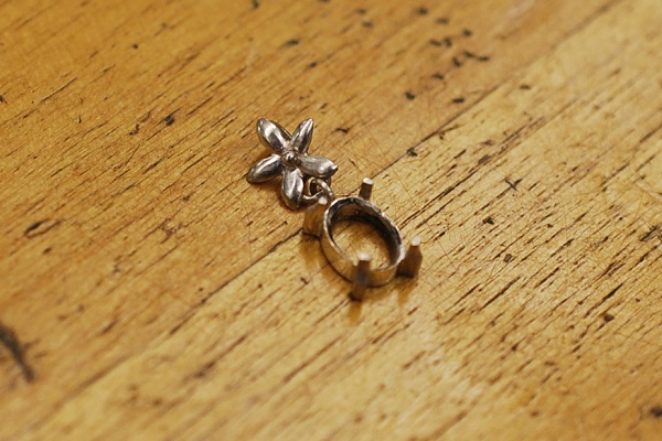 貴金属加工のカリキュラムの課題ですがバチカン部分は好きなデザインにできるので、小さな可愛らしい花の形のバチカンを削り出して作られています。