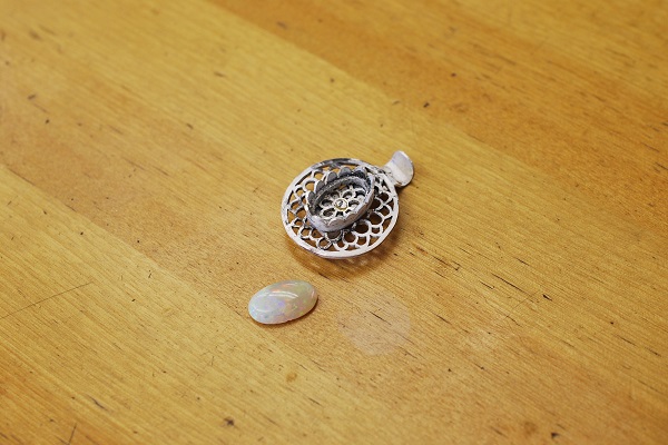 シルバーの板を切り抜いて細かい柄を表現された本体部分にオパールを留めるための石座をロー付けされています。