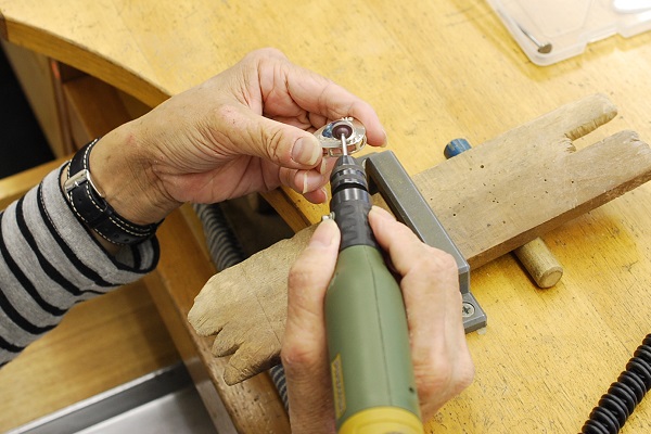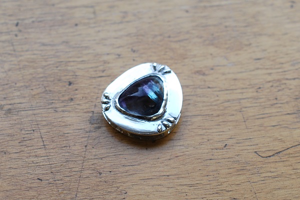 アオスジアゲハさんに見守られながら以前ご紹介したフローライトのペンダントをワックスで作られていた生徒さんが、シルバーで鋳造されてきたペンダントを石留して完成されました。
