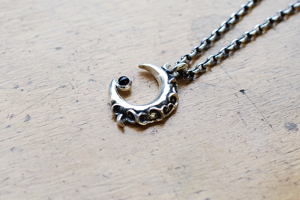 月のモチーフに唐草を絡めたデザインに丸いカボッションカットのオニキスを合わせられています。