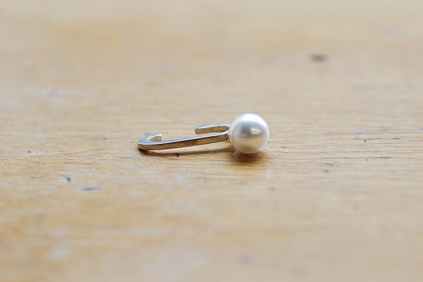 シルバーの地金から製作されました。細く伸ばした角棒を曲げてイヤーカフスの本体を作り、パールを接着するための受け皿を薄く伸ばした板材で作られています。