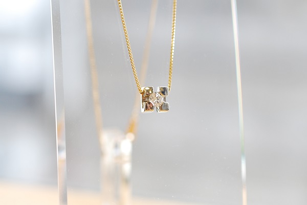 4本の柱でダイヤモンドを支え、その柱の下の部分に空間を作り、あえてk18イエローゴールドのベネチアンチェーンを通しています。