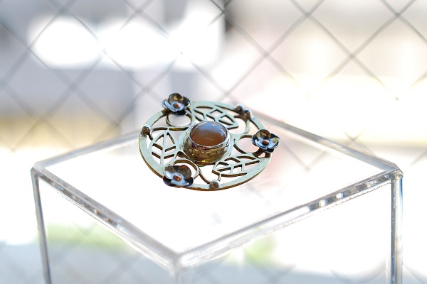 本体は真鍮で石座はシルバー、花のモチーフは洋白と銅を使ってすべて地金から製作されています。