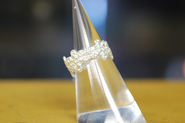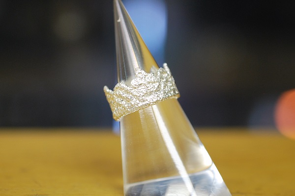 レース生地の端を蜜蝋ワックスで接着した部分も、シルバーで鋳造されてきてからの仕上げ作業で、違和感がないようにレース生地の柄を削り出されていました。
