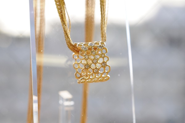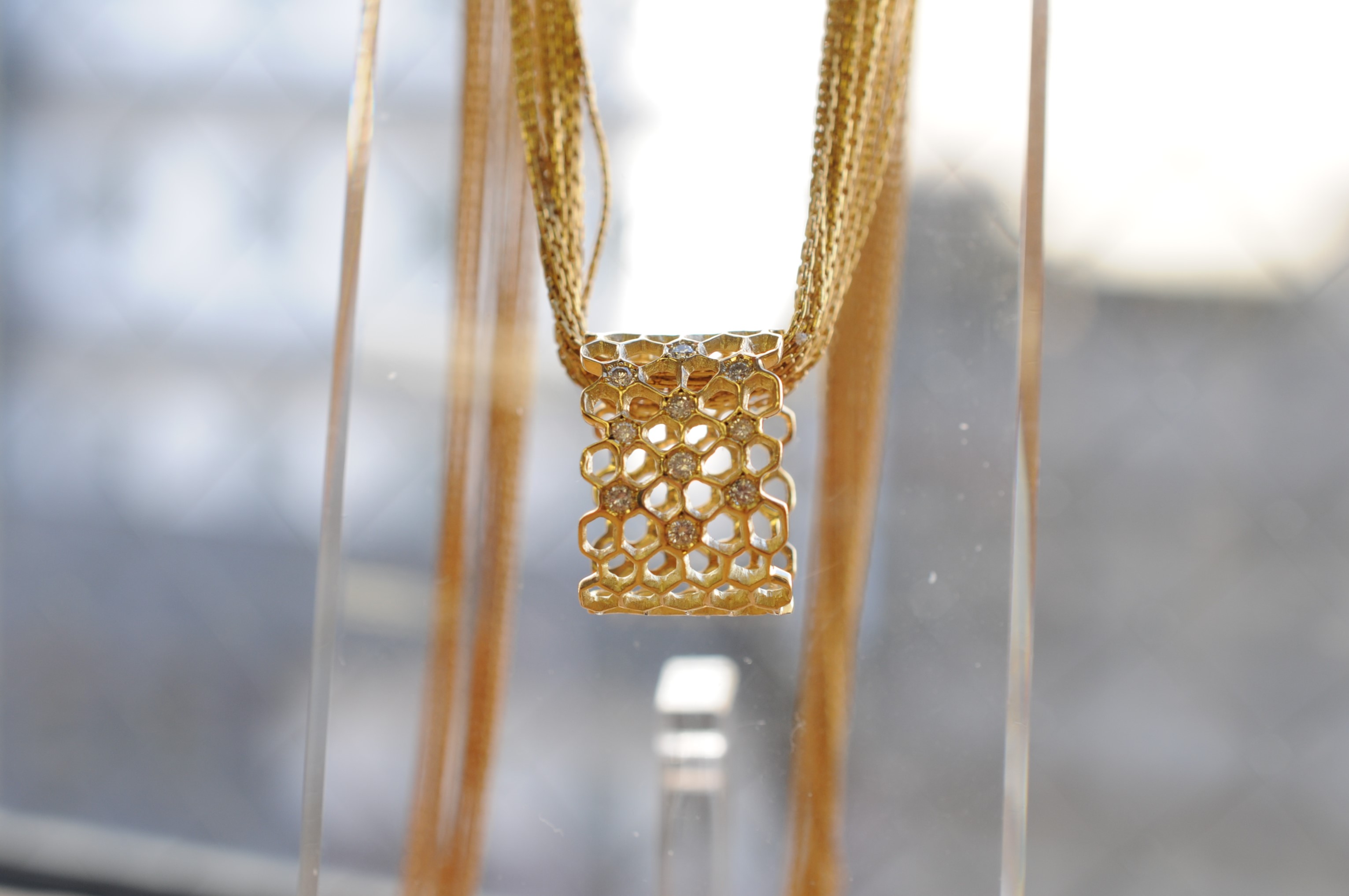 かなり前にご親族から受け継がれた、イタリア製でかなりボリュームのあるゴールドチェーンに合わせるペンダントトップを作ってほしいとの依頼だったので、チェーンに負けない存在感があり、出来るだけ軽く仕上げるためにハニカム構造のデザインにしています。