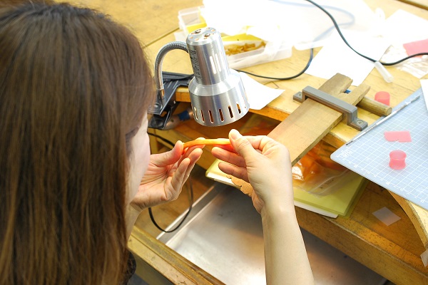 リング本体部分はシートワックスで作り、その上に蜜蝋ワックスを加工したリングを貼り合わせて一つのリングにしていきます。