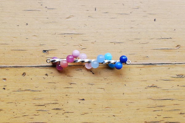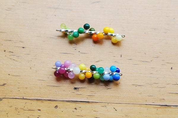 かなりカラフルな仕上がりです。らせん状にガラスのパーツを付けたバージョンはグリーン系とイエロー系のグラデーションで可愛らしい配色になっています。